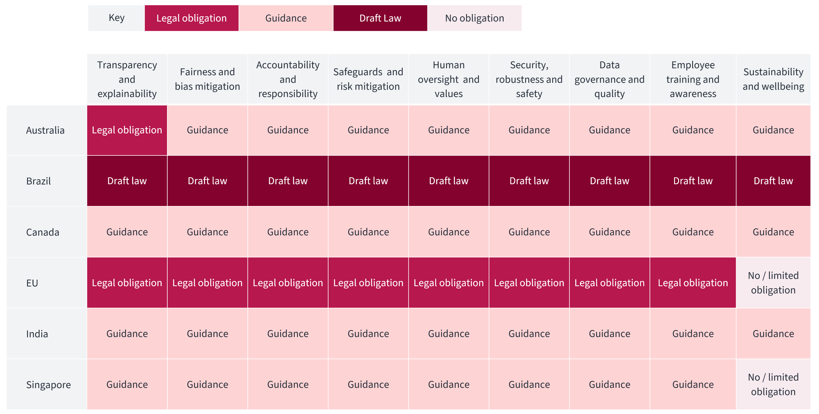 This table sets out a comparative overview of AI governance frameworks in key jurisdictions around the world. This information is taken from detailed underlying legal analysis available within Rulefinder Data Privacy’s AI Regulation & Governance module. Note: we will be continuously monitoring and adding new jurisdictions over the coming weeks and months.