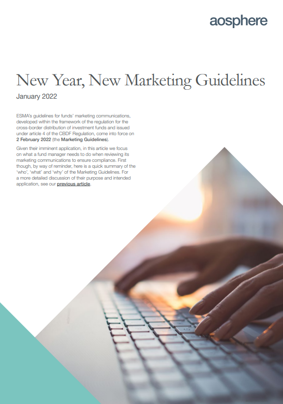 ESMA’s guidelines for funds’ marketing communications, developed within the framework of the regulation for the cross-border distribution of investment funds and issued under article 4 of the CBDF Regulation, come into force on 2 February 2022 (the Marketing Guidelines).