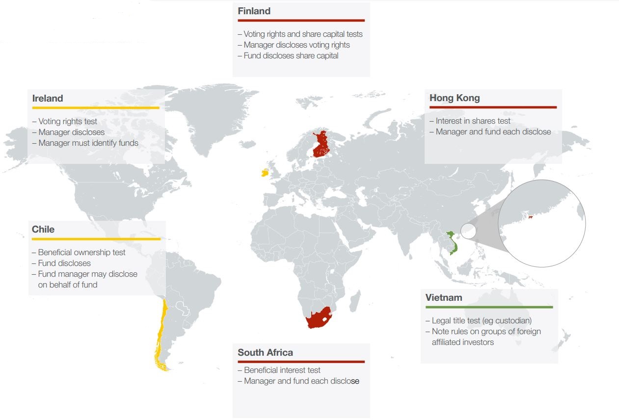 Outside the EU, the disclosure triggers are more varied and, therefore, the position becomes considerably more complex for the investment manager. As well as voting control, a disclosable interest may arise, for example, on the basis of legal title (eg Vietnam), a beneficial interest (eg South Africa), or some broader interest in shares (eg Hong Kong). Some of these regimes will capture investment managers with voting and/or investment discretion over their managed holdings. However, terms such as “beneficial interest” or “interest in shares” have specific local meanings, producing different disclosure outcomes for investment managers.