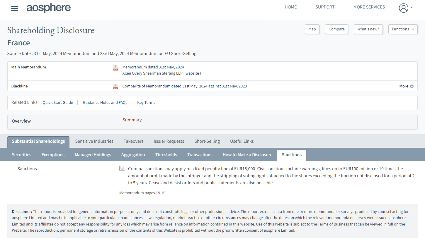 Sample summary of on-screen analysis from Rulefinder Shareholding Disclosure France (published May 2024)