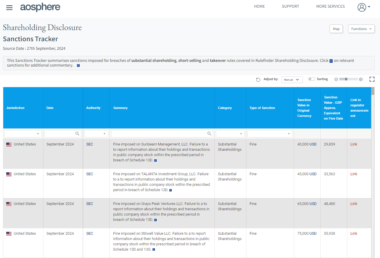 Great question. We have a useful resource which goes beyond what sanctions a regulator can impose, and tracks public sources for examples of recent regulatory enforcement. The Shareholding Disclosure sanctions tracker is very useful in allowing subscribers to identify trends and note any regulators who are particularly active. We also notice certain trends in regulators who apply the rules very stringently for example imposing sanctions if a name is misspelt on a form or those who are more lenient. The subscriber feedback we have received is that the tracker allows investors to build a picture of how a particular regulator approaches fines and any jurisdictions where they need to be extra careful.