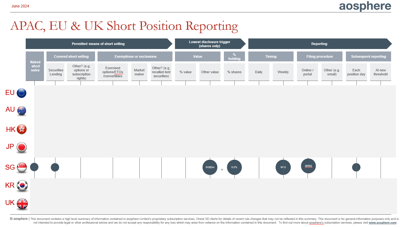 Our Global View (Singapore only in this sample) first flags to users how they can conduct short selling (can you make naked short sales?; do you cover your sales and how?; are there any exemptions?). It then goes on to discuss disclosure obligations (what is the trigger(s) for disclosure?; what is the timing for disclosure?; how often should positions be assessed?; how do you make a submission?). Our full Subscriber infographic gives this detail, for all 7 net short position jurisdictions as well as for the gross short position rules in Canada and the USA, and also includes detailed points to note and a user guide for aosphere’s in-report tools.