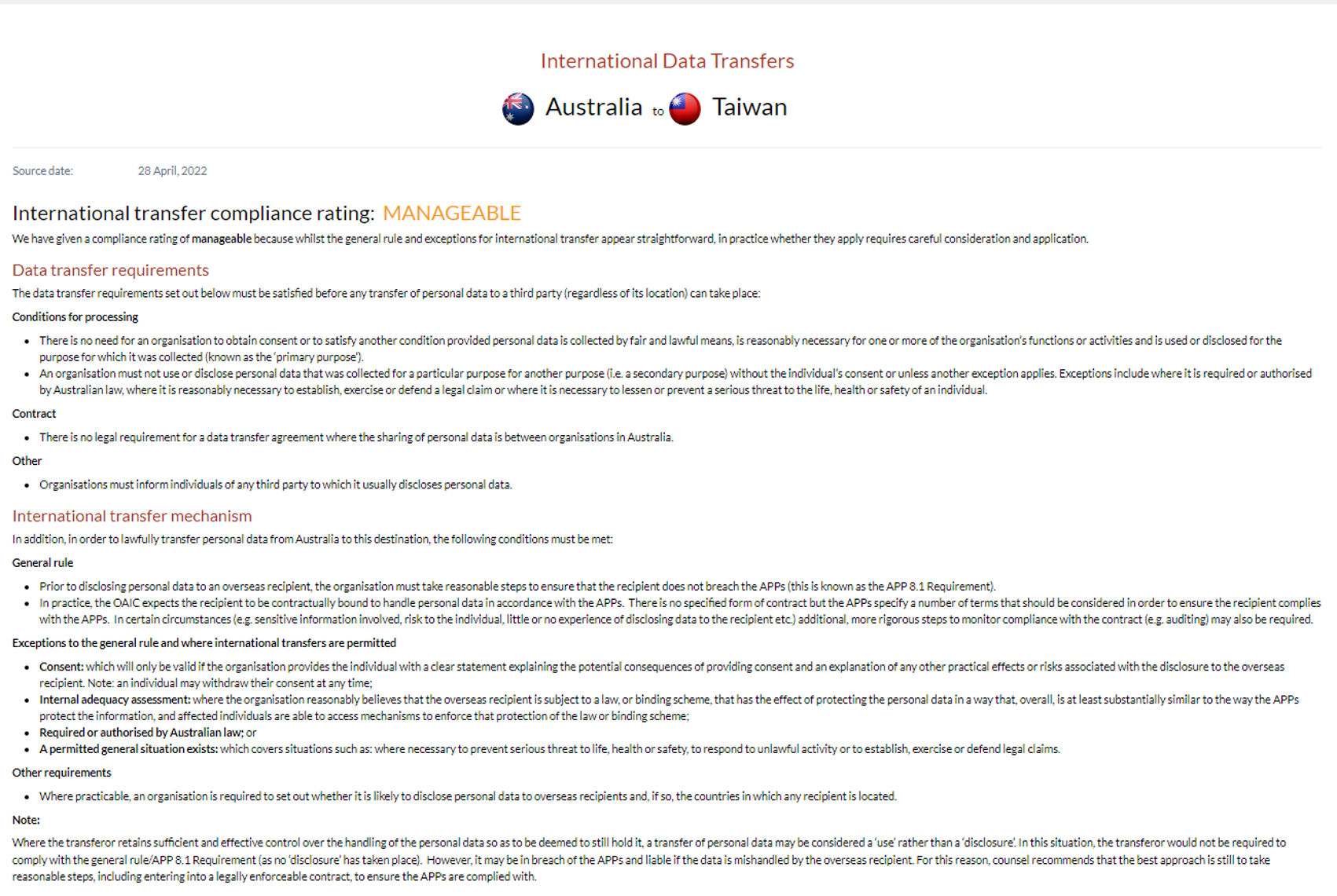 Screenshot showing requirements when transferring data from Australia to Taiwan. Extracted from Rulefinder Data Privacy.
